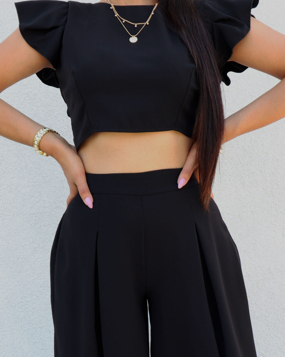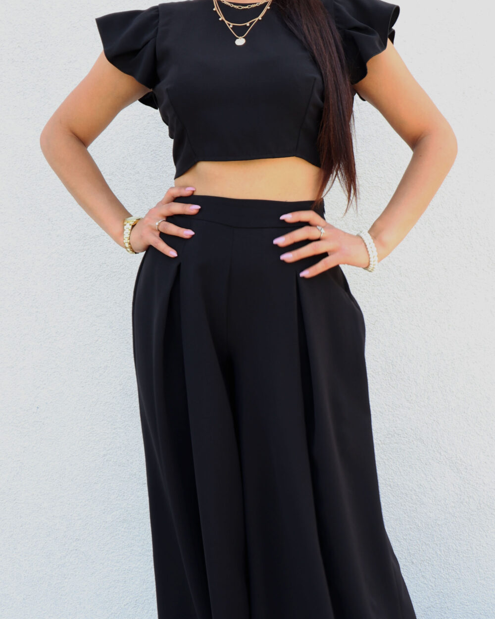 Krótki top wiązany z tyłu na plecach w połączeniu z bardzo szerokimi spodniami z kontrafałdami wygląda zjawiskowo i świetnie pasuje dla Pań zarówno wyższych jak i niższych. Nasz komplet wykonany został z niezwykle delikatnej i lekkiej tkaniny o fakturze muślinu, co jest dodatkowym jego atutem. Zaprojektowany w sposób taki, aby nie musiał zakrywać wszystkich kobiecych miejsc. Krótki top przepięknie wyeksponuje talię i w bardzo subtelny sposób odsłoni kawałek brzuszka, natomiast szerokie spodnie o fasonie palazzo w sposób efektowny wyeksponują pośladki. W połączeniu z odpowiednio dobraną biżuterią tworzy niezwykle elegancki look. Warto również dodać, ze nasz komplet można rozdzielić i połączyć z dowolnie wybranymi przez siebie asortymentami. Jeden ubiór, a wiele możliwości.