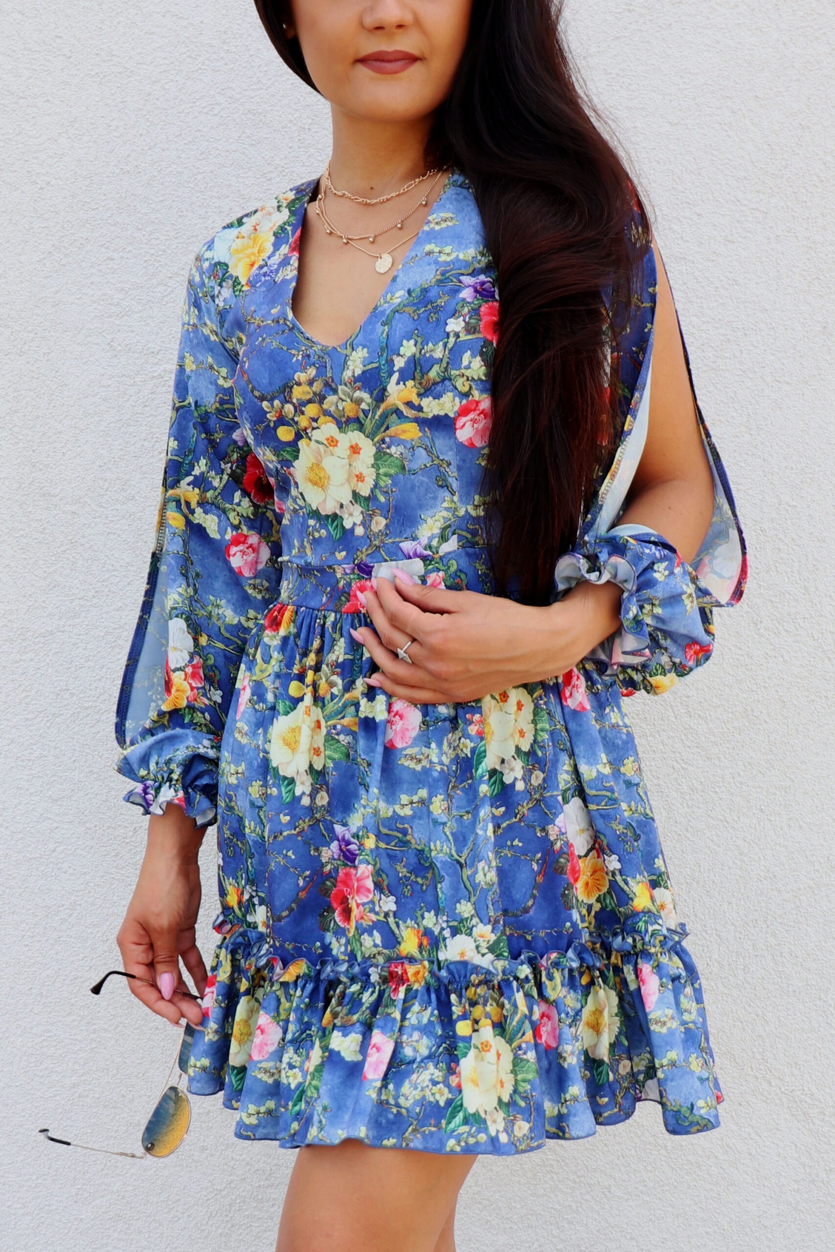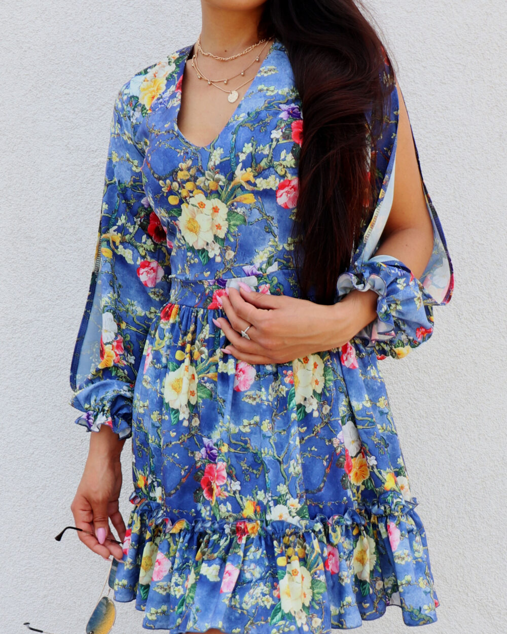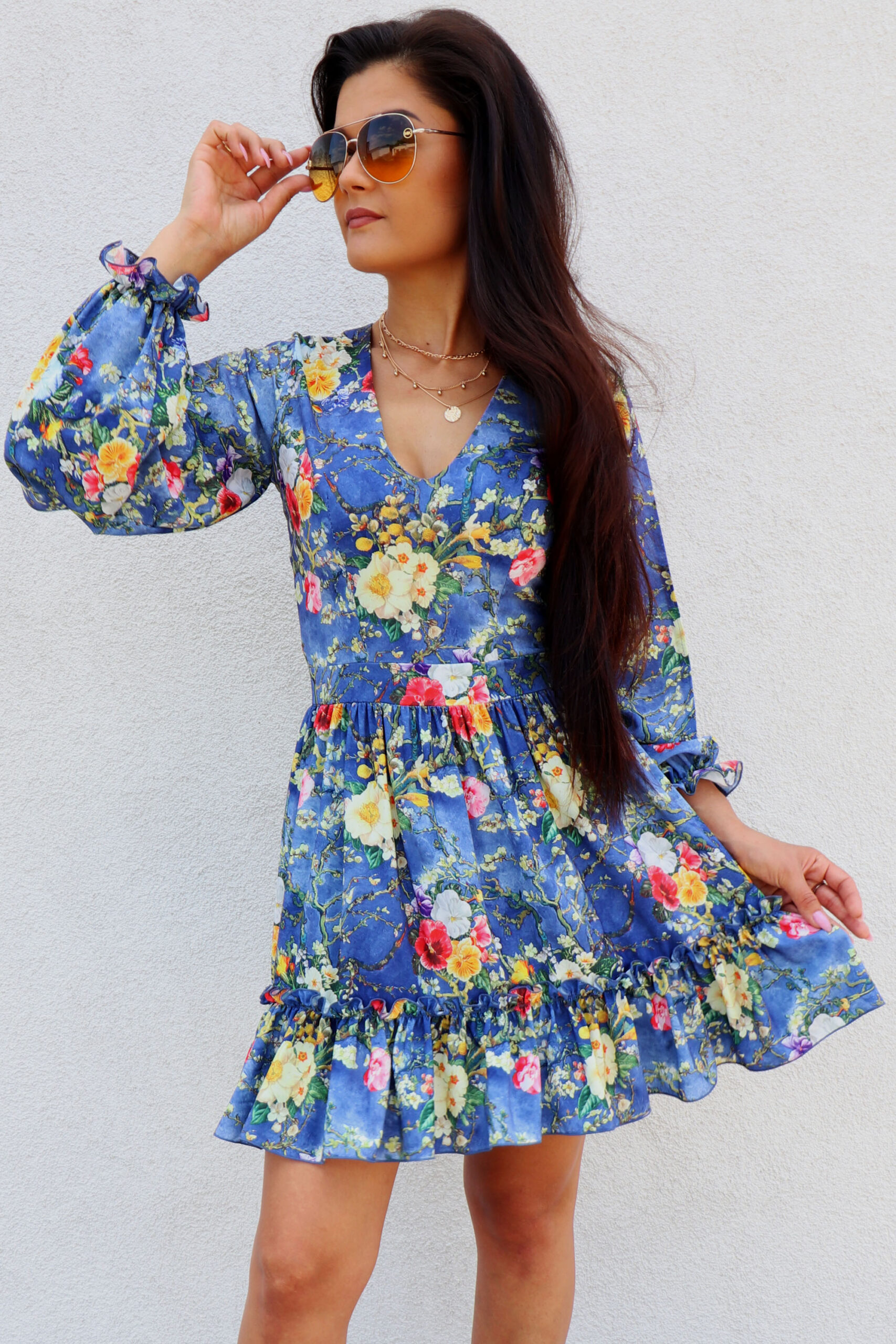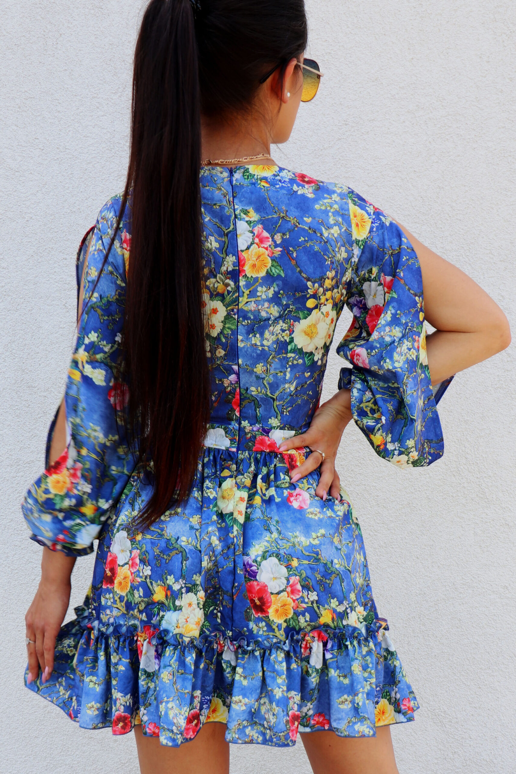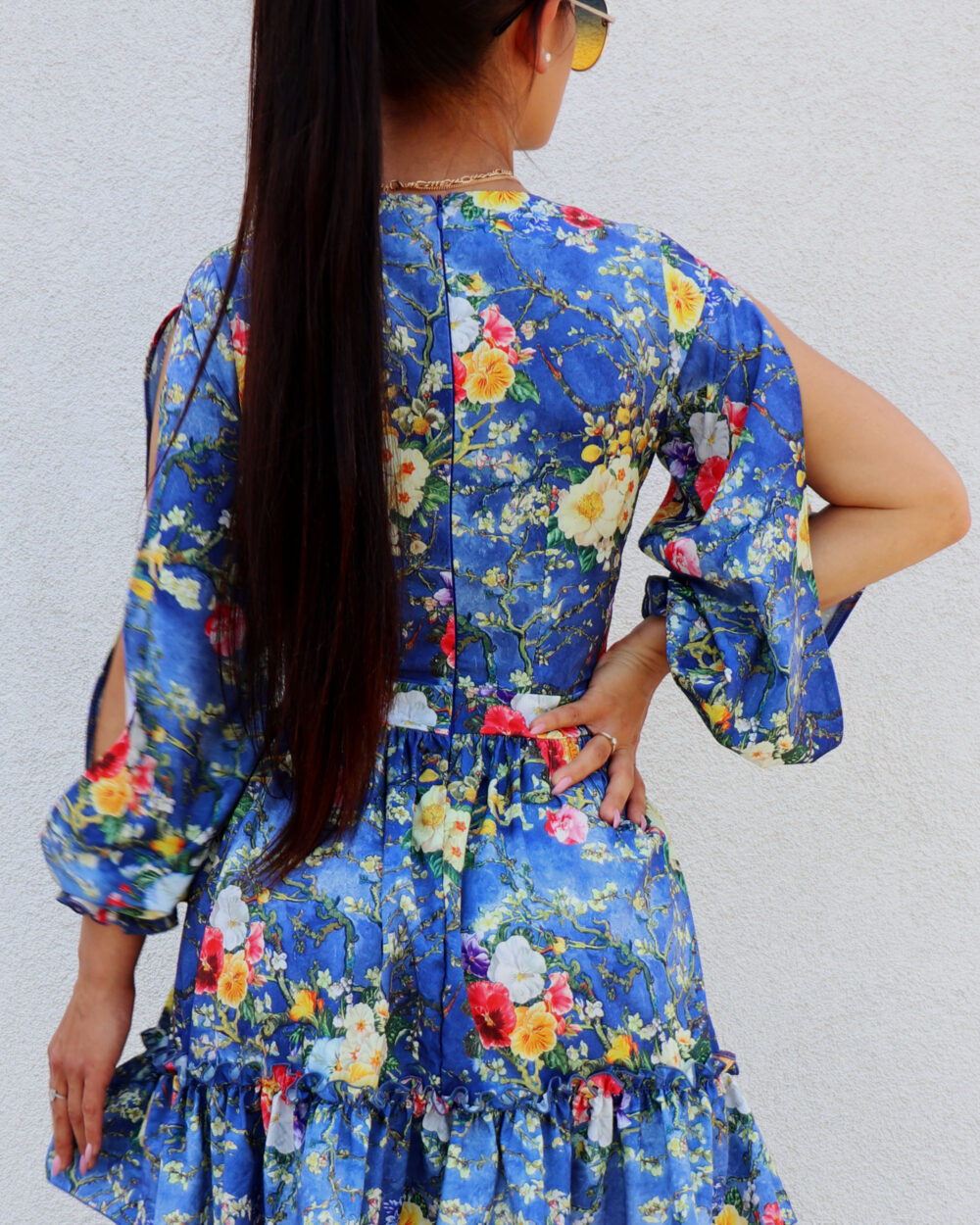 Prezentowana sukienka wykonana została z niezwykle lekkiej i przyjemnej w dotyku tkaniny. Dzięki niej można poczuć powiew wakacyjnej radości. Jest to idealna pozycja dla kobiet praktycznie w każdym wieku – dla kobiet które po prostu nie lubią nudy. Przepiękne kwiatowe printy i przy tym niezwykle żywe i wyraziste kolory, sprawią iż wszyscy oniemieją z zachwytu na Twój widok. Oryginalny i bardzo szczegółowy deseń tworzy przepiękny bukiet kwiatów bratków w tęczowych kolorach. Nasza Sukienka posiada niewielkie falbanki w części dolnej i została wykonana w wersji mini. Zabudowane plecy oraz dekolt w serek przepięknie zaprezentuje się na każdym typie figury. Jej dodatkowym atutem i tym samym mocnym urozmaiceniem są rozcięte rękawy, które eksponują damskie ręce. Sukienka zapinana jest z tyłu na zamek kryty i posiada odcięcie w talii, dzięki czemu jest niezwykle wygodna.